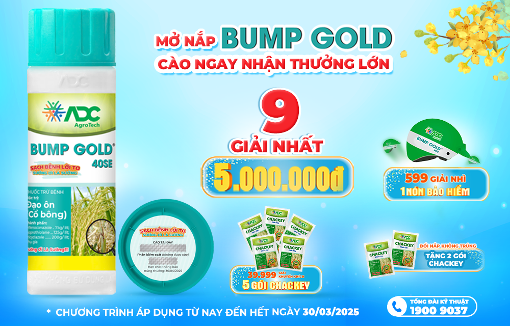 Khi bà con mua Bump Gold 40SE đặc trị đạo ôn cổ bông, cổ gié của ADC, bà con có cơ hội nhận ngay thẻ cào may mắn bên trong nắp chai, để có cơ hội cào trúng những giải thưởng vô cùng hấp dẫn.